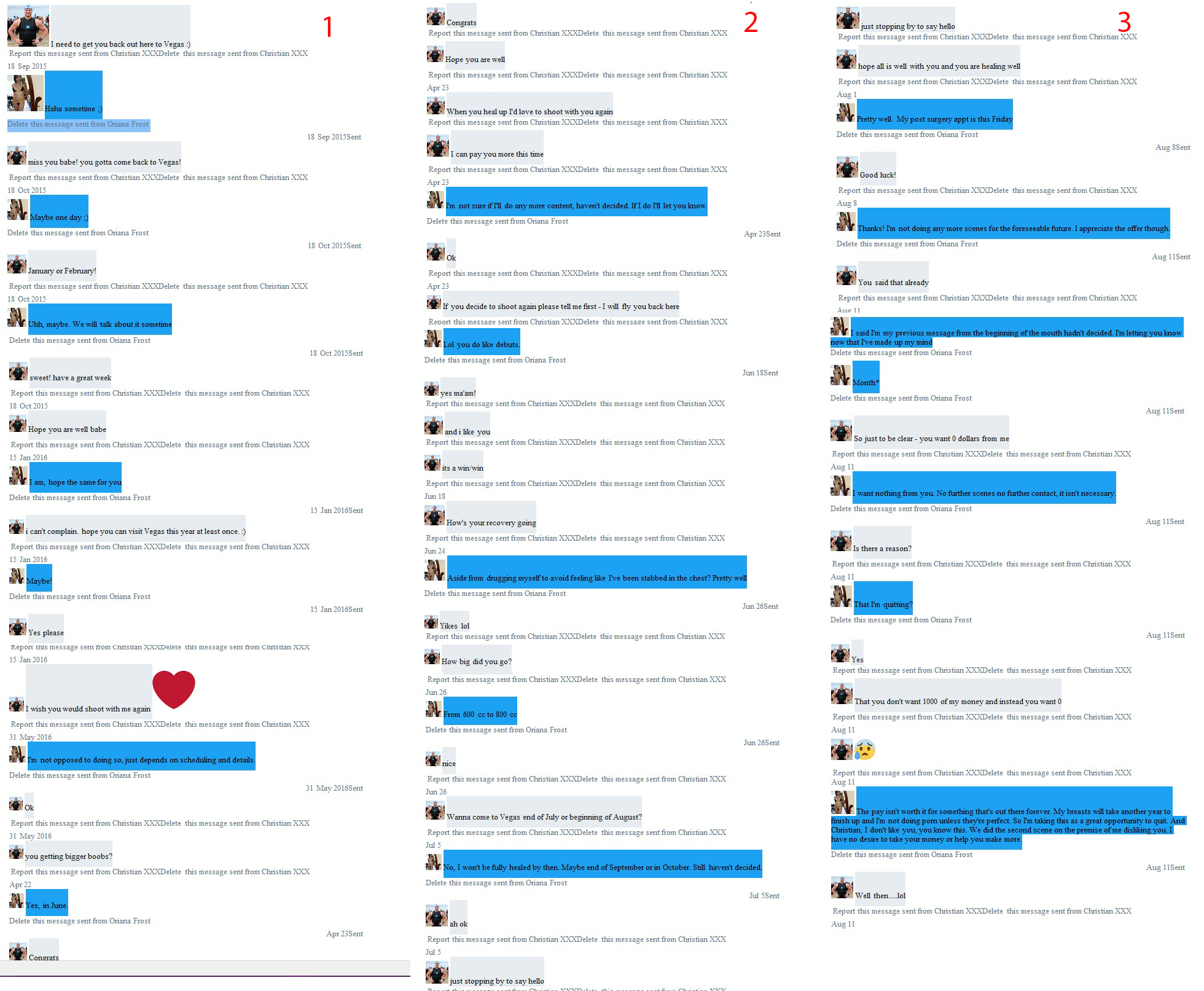 Sporadically throughout 2015 and 2016 Christian would ask or talk about me coming back out. I always used a vague yet polite response back. These are included as screenshots, and well as our lovely exchange this year. In 2016 I needed a surgery to have a muscle fixed, after that I lost tissue in my breasts and had to have them redone. I did and afterwards Christian asked if I would want to do a scene with him again. I told him I was unsure. I then decided to quit and announced my retirement from the industry. As a courtesy I sent Christian a message letting him know what I had decided. Christian then ridiculed me for not taking his money, 1000 is not enough for me to fuck him again, it's not that I don't understand the basics of money/income/investing, it's that 1000 is not worth my dick going in his old ass again. I swear that part of his rectum would pull out with my dick with every thrust. I explained to Christian that I did indeed understand what I was doing and that I didn't like him. I told him he knew this and that we even based the second scene off this fact.